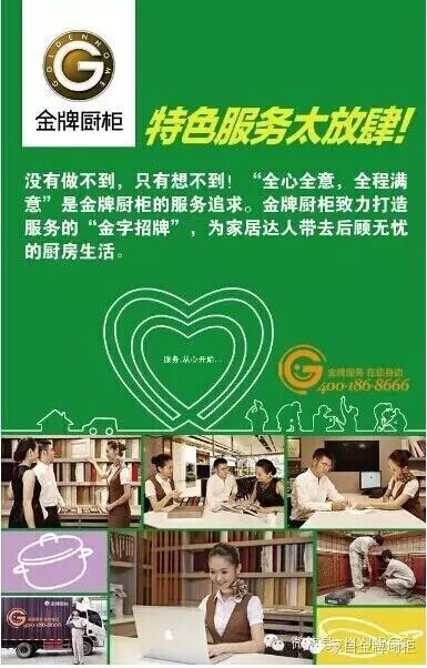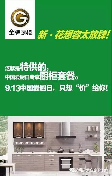 金牌厨柜,如此惊喜,我们要放肆不要拘谨,高端厨房不再是你的梦想!让梦想照进现实,从厨房开始,关爱家人!9.13中国爱厨日,全国700城为爱下厨,传递幸福生活正能量 让我们一起呼吁亲情回归,从现代家庭的生活中心——厨房出发,找回幸福! 如果你平常工作忙,吃饭总是凑合,那到了周末一定带全家出去吃。但是,如今“苏丹红”、“地沟油”等事件一再爆出,令人对食品安全产生了严重的焦虑。下馆子并不一定能让家人吃得健康,吃得幸福。从“中国爱厨日”起,您可以亲自为家人下厨,多做一些健康家常菜,让孩子对父母做的每一顿美食都能够带有纯真的记忆,这也是人生的一种幸福!从“中国爱厨日”起,为家人煮出一碗健康的“幸福”家常菜。